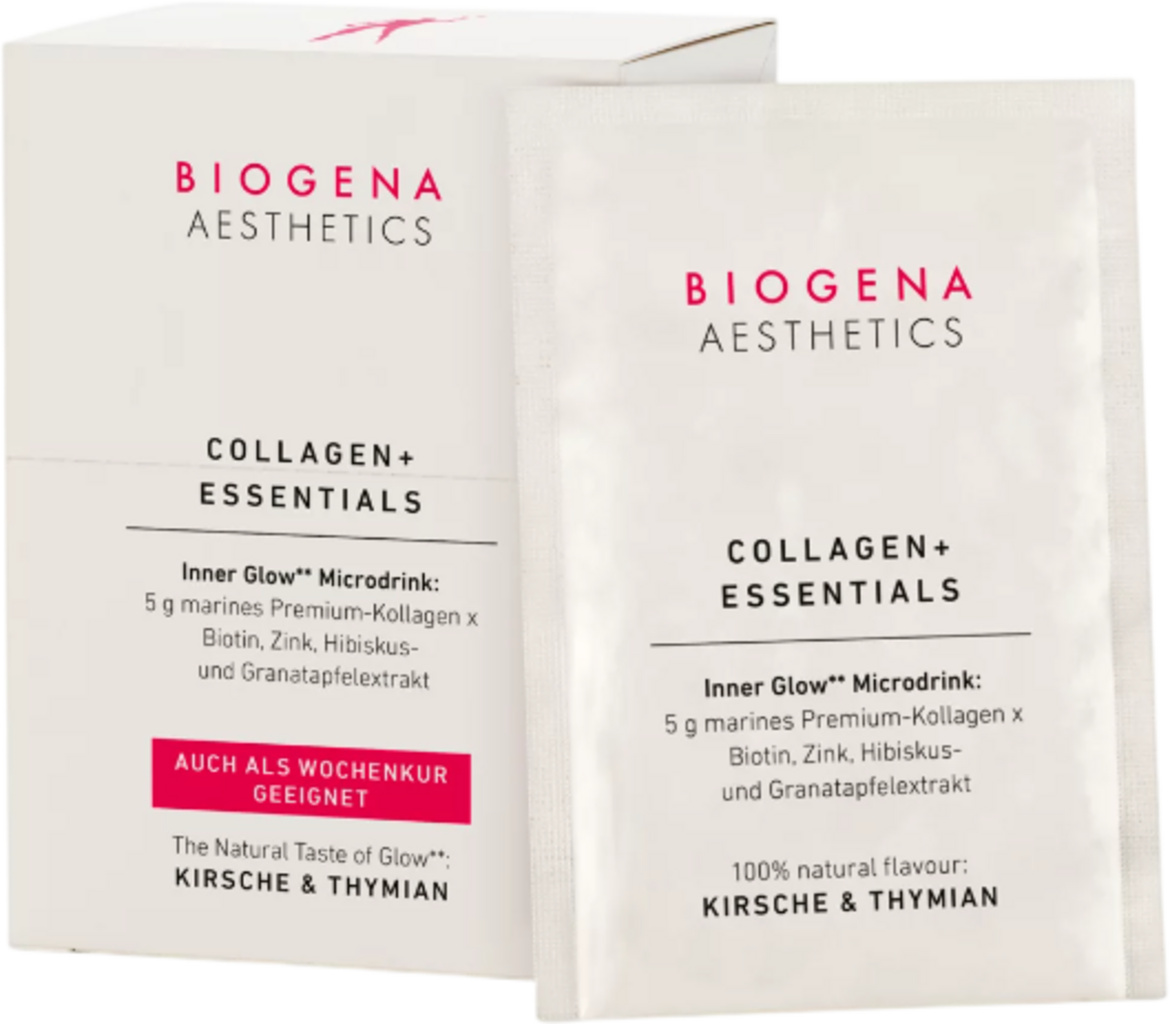 BIOGENA Collagen+ Essentials has a refreshing cherry and thyme flavour and combines carefully selected ingredients to create a premium blend. The NATICOL® collagen it contains is mainly based on fish collagen type I peptides and is characterised by its particularly high bioavailability. It is sourced from responsible aquaculture, which supports the sustainable protection of marine resources. The product is supplemented with biotin, zinc, pomegranate extract and hibiscus flower extract - a harmonious combination for radiant and fresh skin.